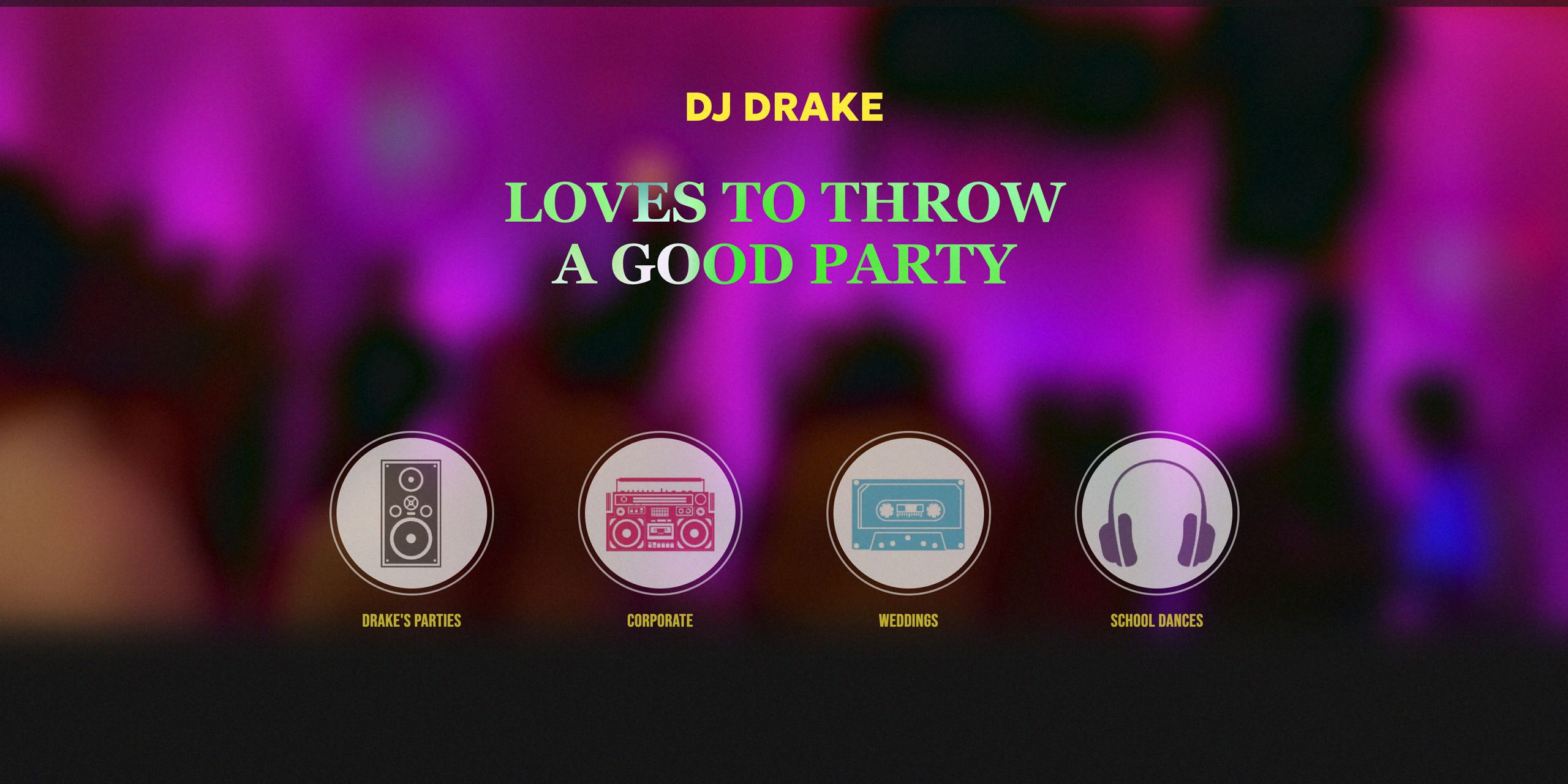 It was time for DJ Drake, a very popular DJ spinning tunes from the 60's to today (with a great love for 80's music dance parties), to update his site. Instead of creating a multi-page site, Drake was interested in a single page site that would be an overrview of his services. Challenge, how to squeeze in the important material and make it fun, like his parties.